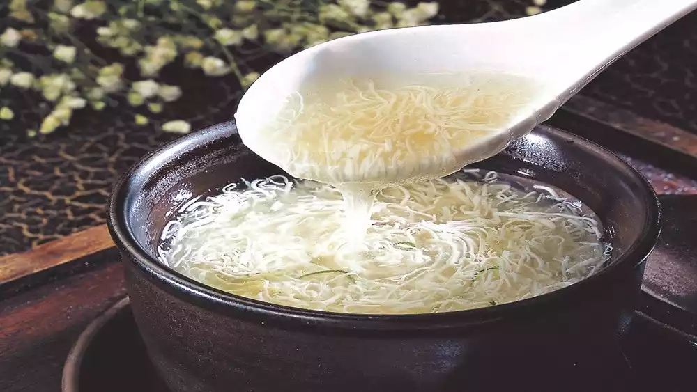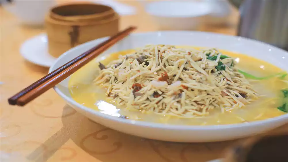 Gansi (dried tofu shreds) are cooked in large amounts of water. This seemingly simple dish is actually quite complex, a hallmark of Huaiyang cuisine. The umami flavor of the ham permeates the finely shredded tofu, creating a seamless texture without a single drop of oil or bean smell.