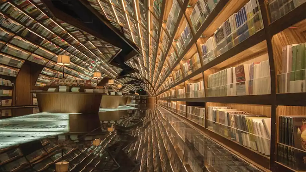 Entering the main entrance of Zhongshuge Yangzhou, you'll find the bookstore's lobby. The designer employed the concept of an arched bridge, continuing Zhongshuge's visual symbolism of a world of books. The sonorous river between the ground and the sky guides readers deeper into the vast ocean of knowledge. The bookshelves on either side, with their graceful curved structures, stretch the skyline, like bridges over a stream.