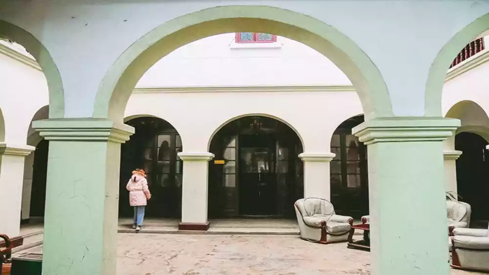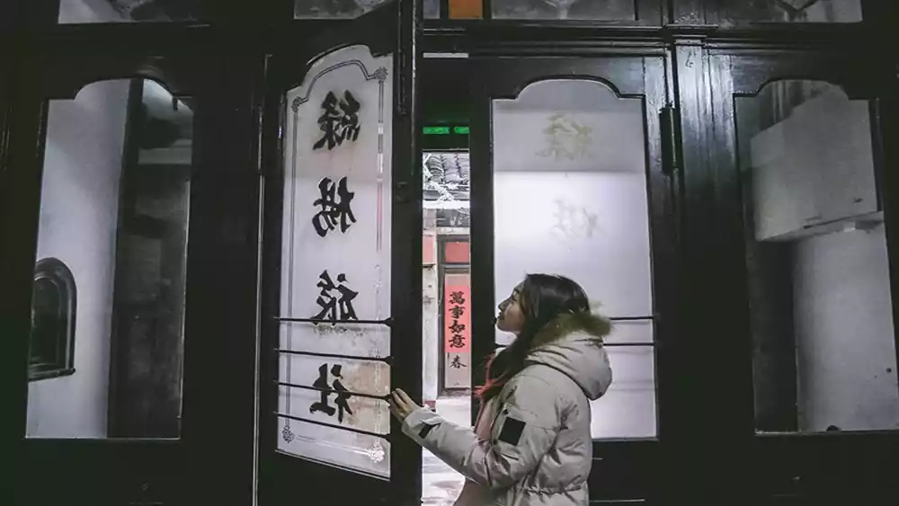 In the narrow alley, you have to look up to see the three-story hotel facade in its entirety. It features a blend of Eastern and Western architectural styles, with the main entrance in the center. Inside, a four-sided courtyard connects the sky and the ground. Wooden staircases lead up to each floor, narrow and steep. Each floor has a U-shaped corridor, all constructed entirely of wood. The second and third floors, facing the main street, each have a small balcony surrounded by green iron railings, offering views of the alley.