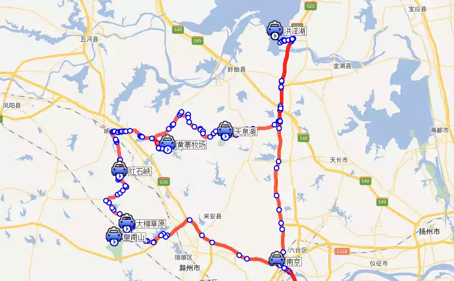 Nanjing - Huangfu Mountain - Dalius Grassland - Hongshixia - Huangzhai Grassland - Tianquan Lake - Hongze Lake, the journey is about 459 kilometers (round trip from Nanjing).