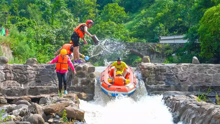 The total length of the rafting is about 2 kilometers, with a total drop of about 30 meters. The dam at the starting point of the rafting has a drop of 6 meters to provide hikers with a "warm-up" experience. Then they go through the arch bridge, enter the forest, and drift through more than ten large and small ponds and dams. Surrounded by towering trees, they pass through the forest at high speed or slowly.