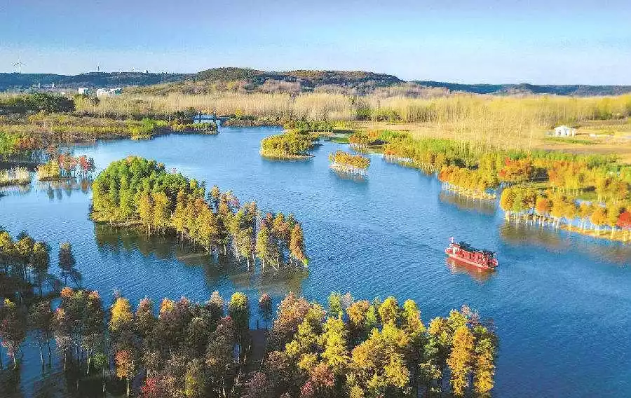 Unique landscape: In late autumn, numerous brightly colored redwoods stand tall in Tianquan Lake, forming a unique landscape painting.