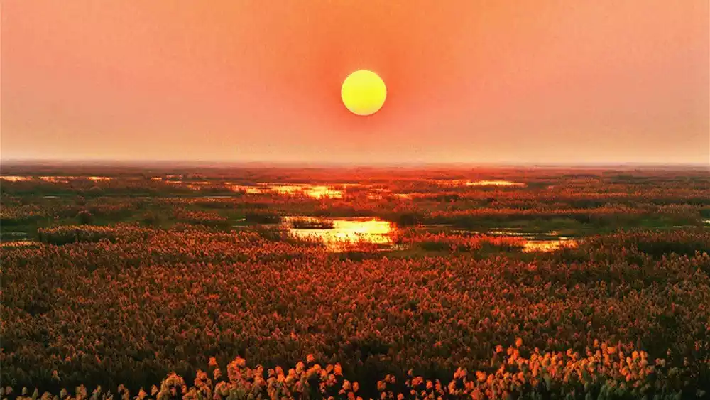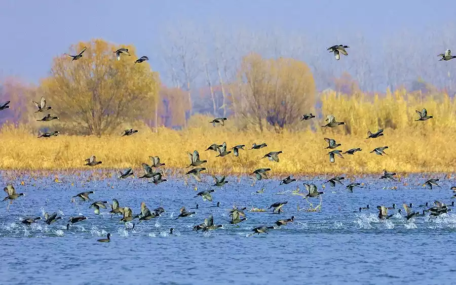 The Hongze Lake Wetland Reserve, East China's largest wetland scenic area, provides a bird habitat. Flocks of birds fill the air, their clear calls incessant, and the sounds of cranes and storks playing in the water create a breathtaking spectacle. Nearly 200 species of birds visit the area each year to overwinter or make a stopover.