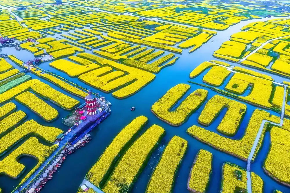 During the Qingming Festival every year, the "Duo fields" surrounded by water in the Qianduo Scenic Area are covered with golden rapeseed flowers, creating a magnificent and charming scene of "rapeseed flowers blooming all over the ground".