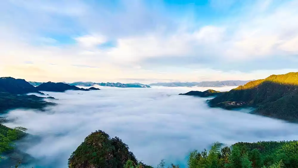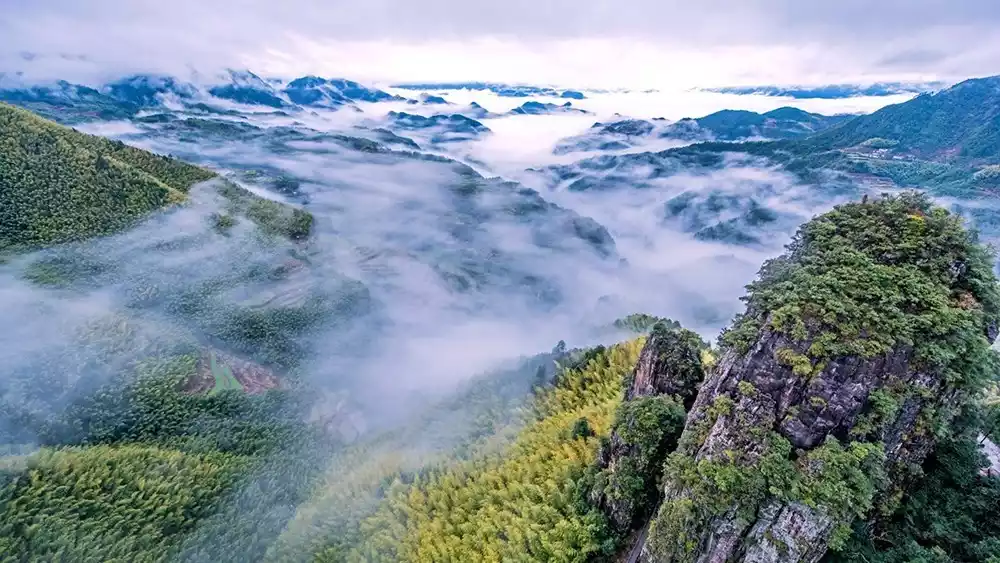 The clouds and mist here come and go without a trace, their ever-changing forms elusive. Standing atop a cliff, awaiting them, one can see a sea of bamboo before one, terraced fields beyond, and distant, overlapping green hills. Suddenly, white clouds rise from the valley floor, vanishing within minutes, only to return like a dragon from the distant valley floor.