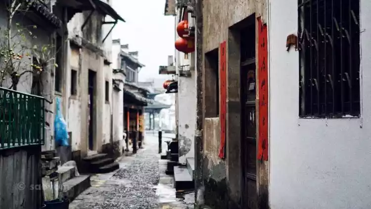 A narrow main street paved with bluestone slabs winds east-west through the village. Both sides of the street are lined with weathered ancient houses, lonely pink walls and black tiles, high horse-head walls, small black tiles, and natural wooden doors. The harmony and nature testify to the former prosperity of this water transport and commercial port.