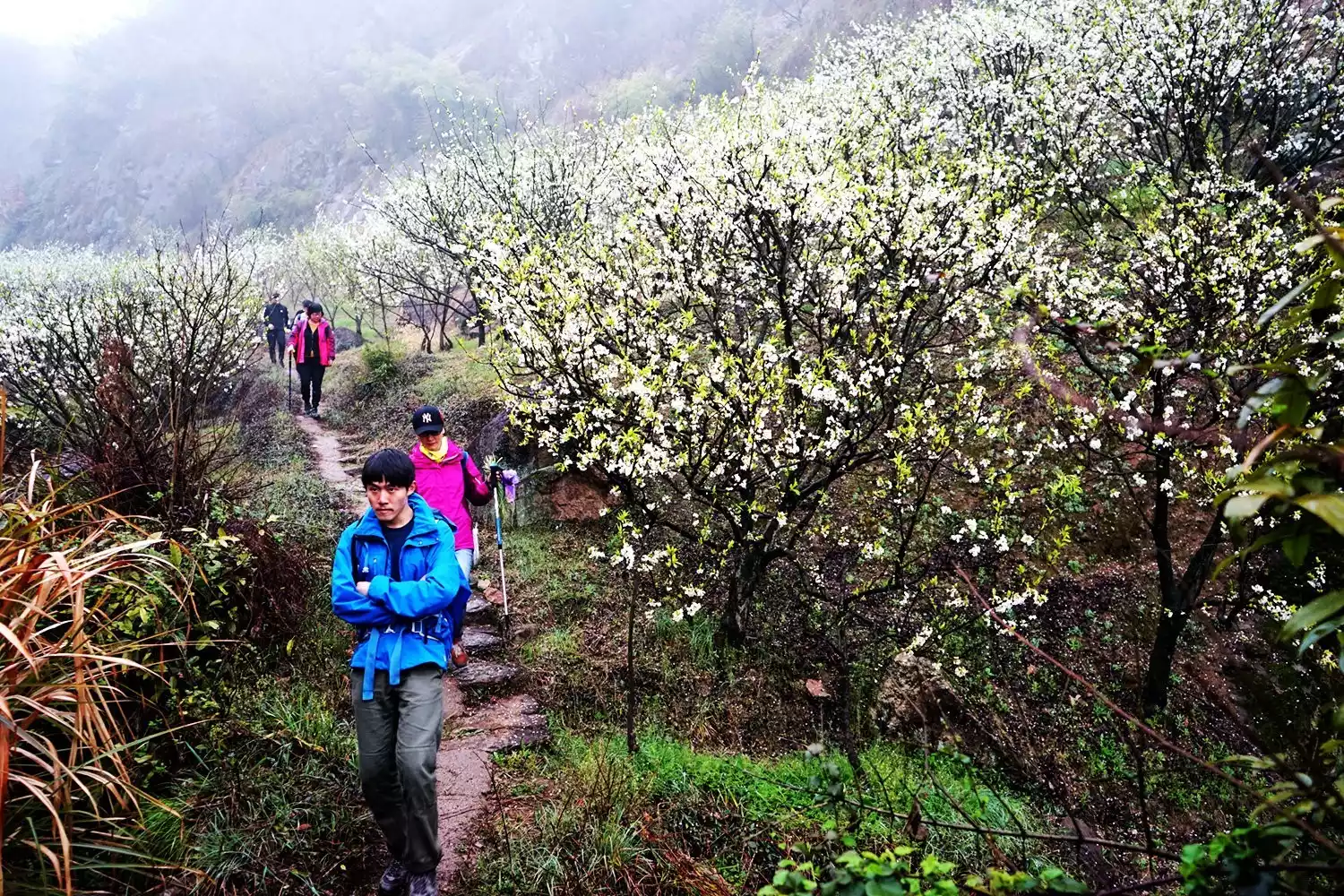 Then, we'll walk up the mountain past the village, then over a hill and down towards Yuandong Village. We'll pass through a lush bamboo forest, and along the way, we'll see a variety of wild flowers, including cherry blossoms, pear blossoms, plum blossoms, and crabapple blossoms, creating a beautiful scenery.