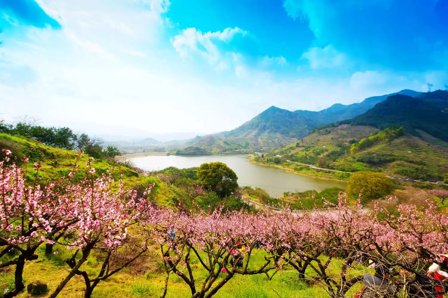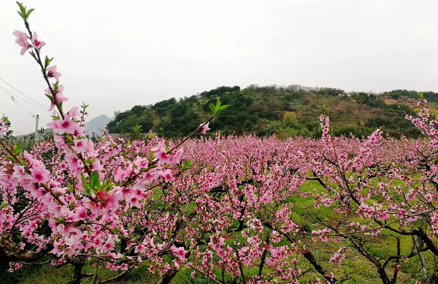 South of Zhuanlun Rock, past the hills behind the main peak, you enter the Meijiang Basin. This is Yuandong Township, part of Jinhua City's East District. It's a designated agricultural demonstration township and the primary production area for Yuandong white peaches. Tens of thousands of acres of white peach orchards enter their pollination phase at the end of March, bringing tens of thousands of peach trees into bloom, a truly captivating sight.