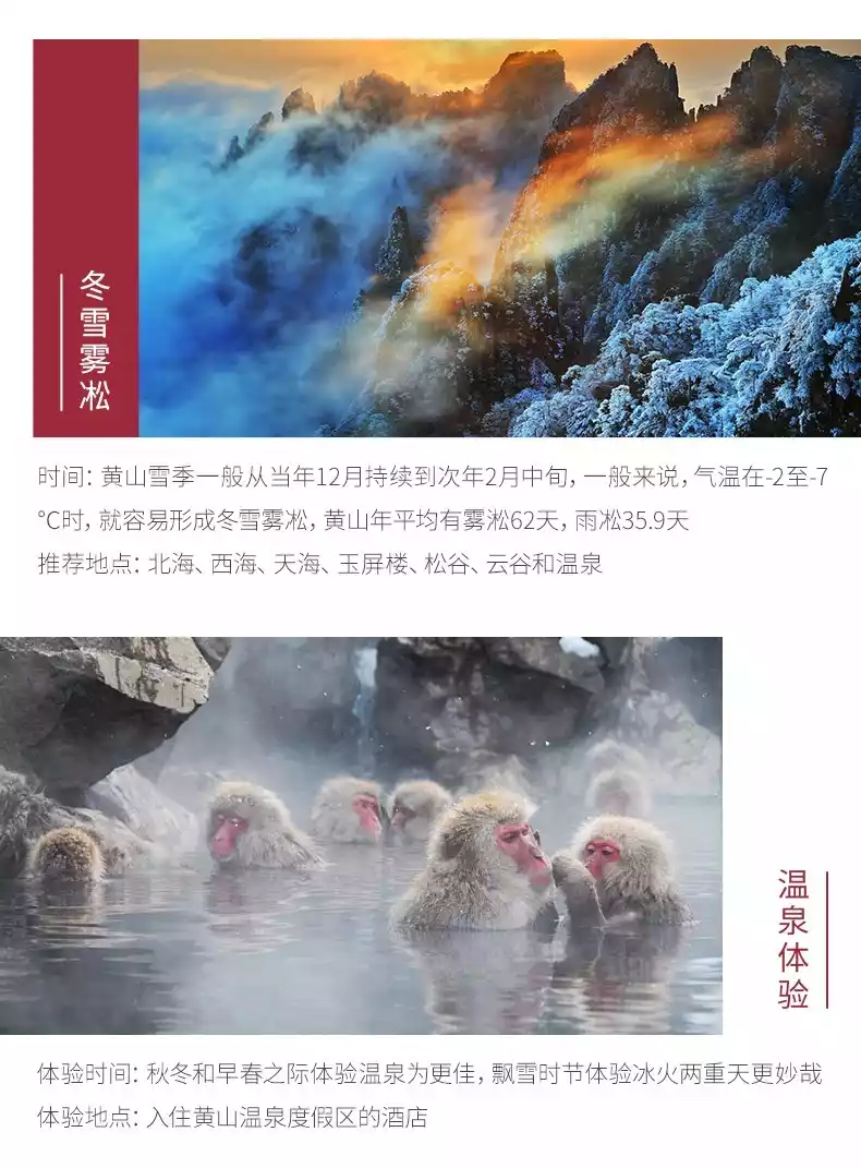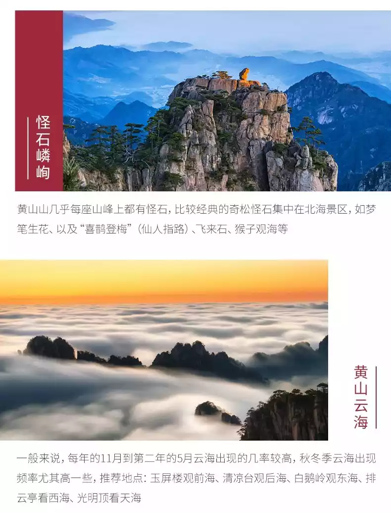 Huangshan's scenery varies throughout the year, with more rainy and foggy days. April to November is the best time to visit, but it's best to avoid the busiest months of July and August. While winter is Huangshan's most beautiful season, with the most sea of clouds, Lotus Peak and Tiandu Peak are generally closed, so there are some trade-offs.
