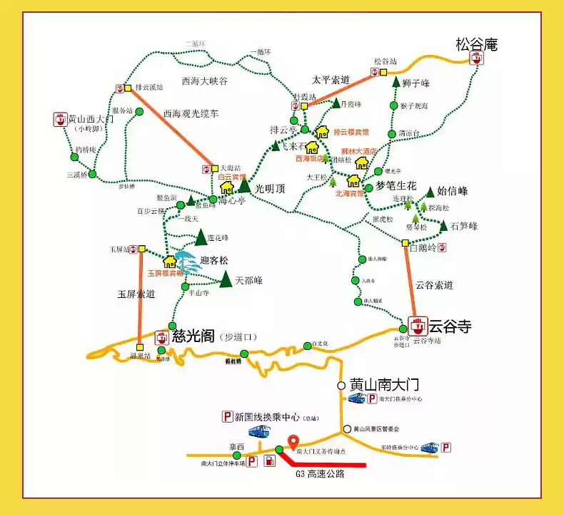 Transfer station (19 yuan) - 25 minutes to Yungu Temple - Yungu Cableway - Baieling Station - Toward Shixin Peak - Little Dream - Phoenix Pine - Eighteen Arhats Facing the South China Sea - Lingzhi Pavilion - Harp Pine - Exploring the Sea Pine - Shixin Peak - Twin Pine - Black Tiger Pine - Beihai Hotel - Dream Brush - Shilin Hotel - Qingliang Terrace - Monkeys Watching the Sea - Return and go up the stairs - Turn right towards Xihai Grand Canyon - Great King Pine - Unity Pine - Xihai Hotel - Go straight after Paiyunlou Hotel - Paiyun Pavilion - North Entrance of Xihai Grand Canyon - First and Second Ring Roads - Valley Bottom - Xihai Cable Car — Tianhai Station — Baiyun Hotel — Turn left and go up the stairs — Guangmingding — Go down the stairs to the right of the Guangmingding elevation monument — Tianhai Food — Haixin Pavilion — Turn left at the fork in the road — Aoyu Peak — Aoyu Cave — Hundred-Step Cloud Ladder — Lotus Pavilion — Golden Turtle Exploring the Sea — Lianrui Peak — Happiness Avenue — Dolphin Stone — Carp Leaping Over the Dragon Gate — Cross the Haohanpo Bridge — Farewell Pine — Yuping Tower (Sleeping Buddha) — Welcoming Pine — Accompanying Pine — Return to Farewell Pine — Turn left at the bottom of Haohanpo Bridge — Futon Pine — Yuping Cableway Station — Yuping Cableway — Hot Spring Station — Scenic Area Bus — 20 minutes to the transfer station