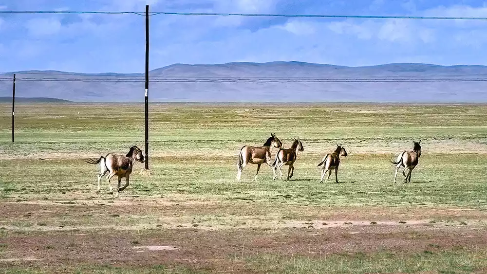 Wild donkeys, living at altitudes above 3,500 meters, like to move in groups and often race across the Hoh Xil grasslands, a way of showing off their charm. They also enjoy racing with cars, stopping only after a vehicle passes them.