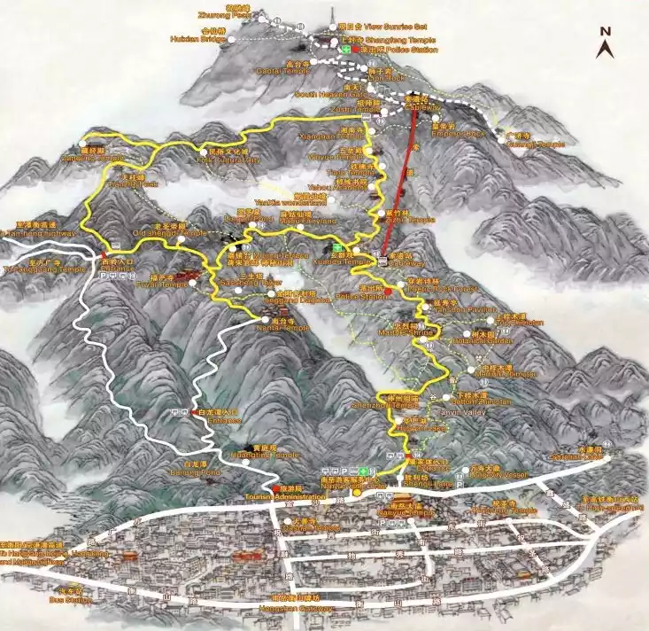 The bold yellow lines along the way are roads, where scenic area vehicles enter and exit, and the dotted yellow lines are hiking trails. The hiking trails and roads intersect so crisscrossed that it can be confusing. However, if you don't know the hiking route, it becomes clear once you exit the road.