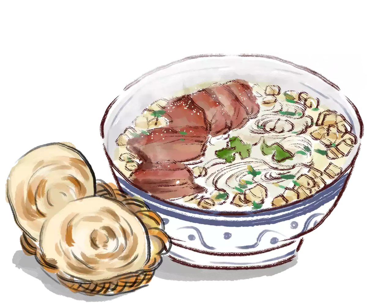 The steamed bun for Hulutou Pao Mo is not a completely unleavened flatbread. When breaking the bun, it is better to keep it small, slightly larger than the steamed bun for beef and mutton Pao Mo. This allows the soup to seep directly into the bun without making it too mushy.
