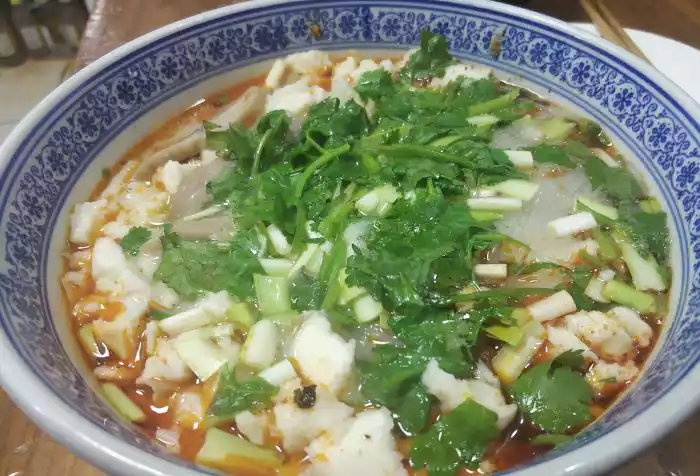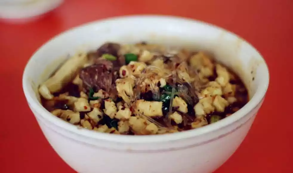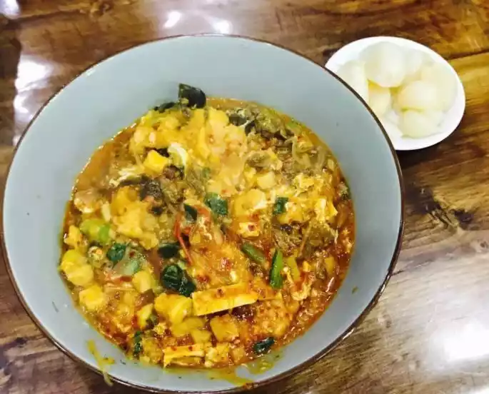 The steamed buns for stir-fry are carefully broken into pieces the size of broad beans. They are then cooked in beef and mutton broth, and then vegetables such as tomatoes, greens, dried tofu, wood ear mushrooms, daylilies, and vermicelli are added, followed by small chunks of beef and mutton. Finally, vinegar and spicy noodles are added. Stir-fry over high heat until the flavors are absorbed and serve. The sour, spicy, and fragrant flavor of stir-fry has earned it a place in the Xi'an snack world.
