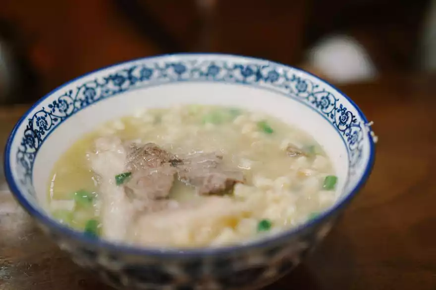 Each bowl of Pao Mo is served with a small bowl of clear soup made from the original soup. This small bowl of soup is then poured into the bowl after eating the Pao Mo. A few mouthfuls of the fragrant soup are taken to rinse the bowl and cleanse the mouth. Only then is the bowl of Pao Mo considered to be a complete meal.