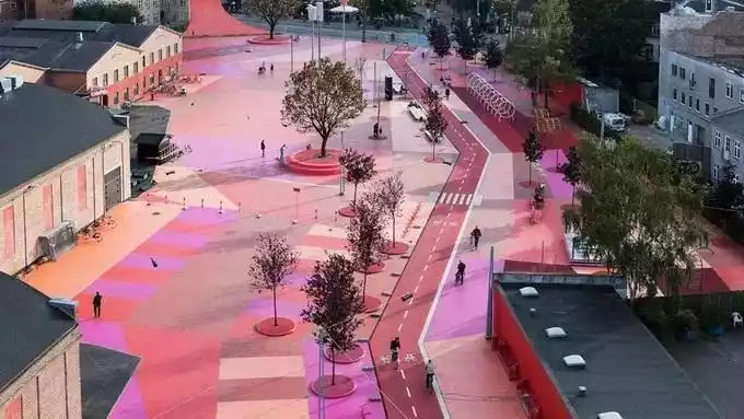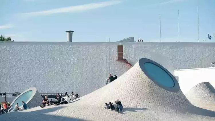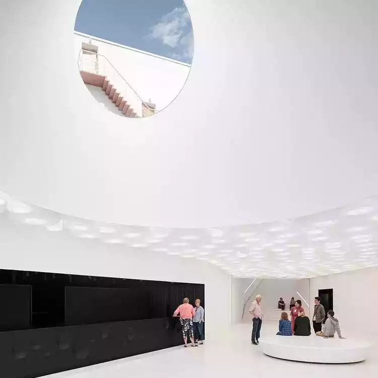 The building, which appears above the ground like a curved "chimney", brings sunlight into the underground space and forms a new "topography" on the ground. Through the magical architectural imagination, people passing by can walk and rest on it, maintaining the functionality of the square itself while blending seamlessly into the environment.