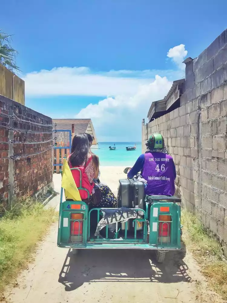 The entire island is not large, so you can basically walk around; or you can rent a motorbike here, which costs about 150-200 baht per day; or a tricycle, which is actually a motorcycle with a bucket cart, they call it a taxi, and the price is 50 baht per person.
