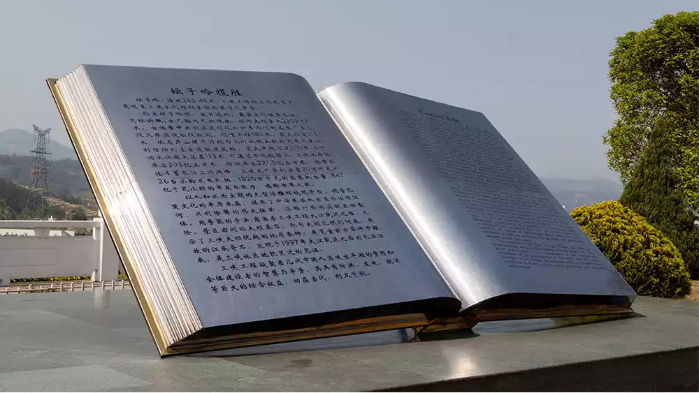 Tanziling Scenic Area also features "Three Stones and One Book." The first cylindrical stone is called the Three Gorges Dam Foundation Stone. Made of granite, it's an incredibly hard rock core drilled from Zhongbao Island. The second, a triangular tetrahedron, is called the Diversion Stone. This stone was used to divert the river, but the model shown here is a model; the actual diversion stone is not this large. The final stone, the Wannian River Bottom Stone, is porous, some formed naturally by river erosion, and others left behind by the earliest experts who surveyed the area. Tanziling Scenic Area also boasts a massive heavenly book, the page of which contains detailed information about Tanziling.
