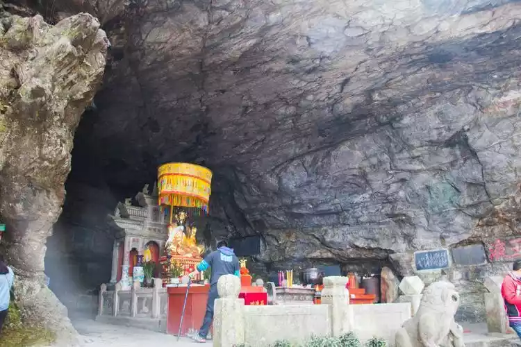 Descending from Jinxiu Valley, you'll reach Xianren Cave, which is said to be the place where Lü Dongbin cultivated his immortality. Just outside Xianren Cave, a toad-shaped boulder overhangs the valley. This cave is a natural formation formed by the sand cliffs. The natural process of weathering and the erosion of the mountains and rivers gradually formed this cave. Chairman Mao's poem, "Nature has created an immortal cave; the boundless scenery lies on the dangerous peaks," refers to this cave. Xianren Cave truly is a massive rock cave where immortals are enshrined.