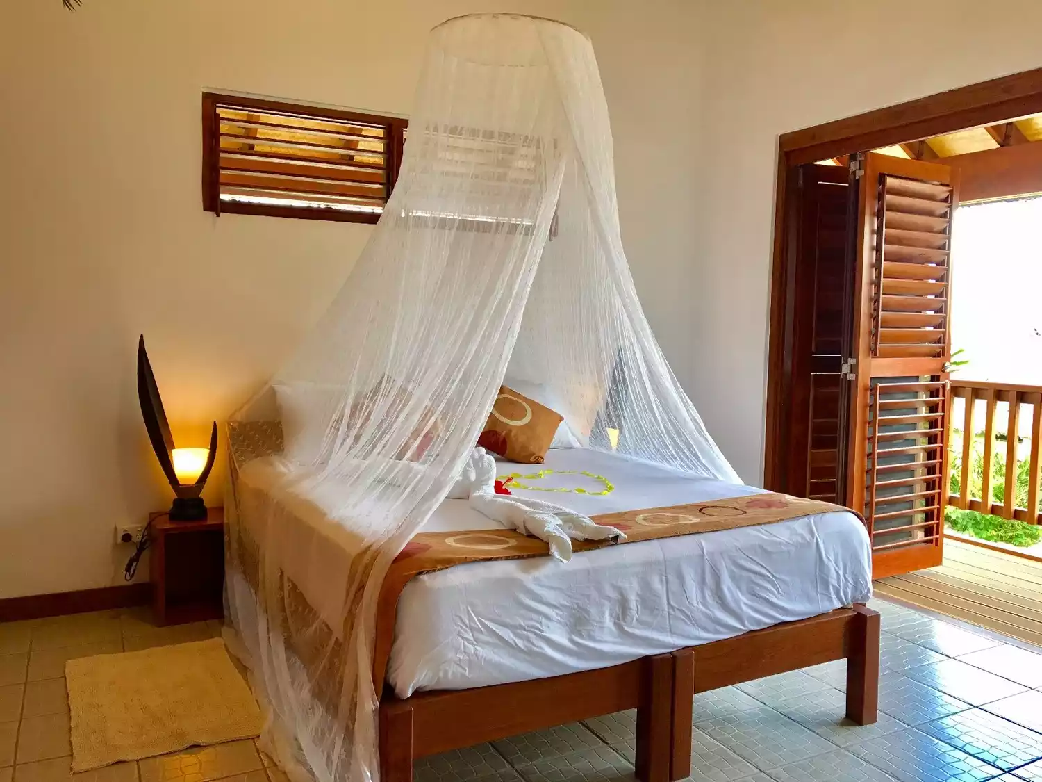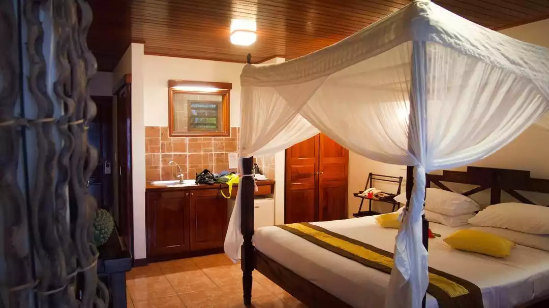 Located on the edge of the lagoon, the bedroom windows open directly onto the lake. It is said that the Sunset Hotel got its name from the beautiful sunset here.