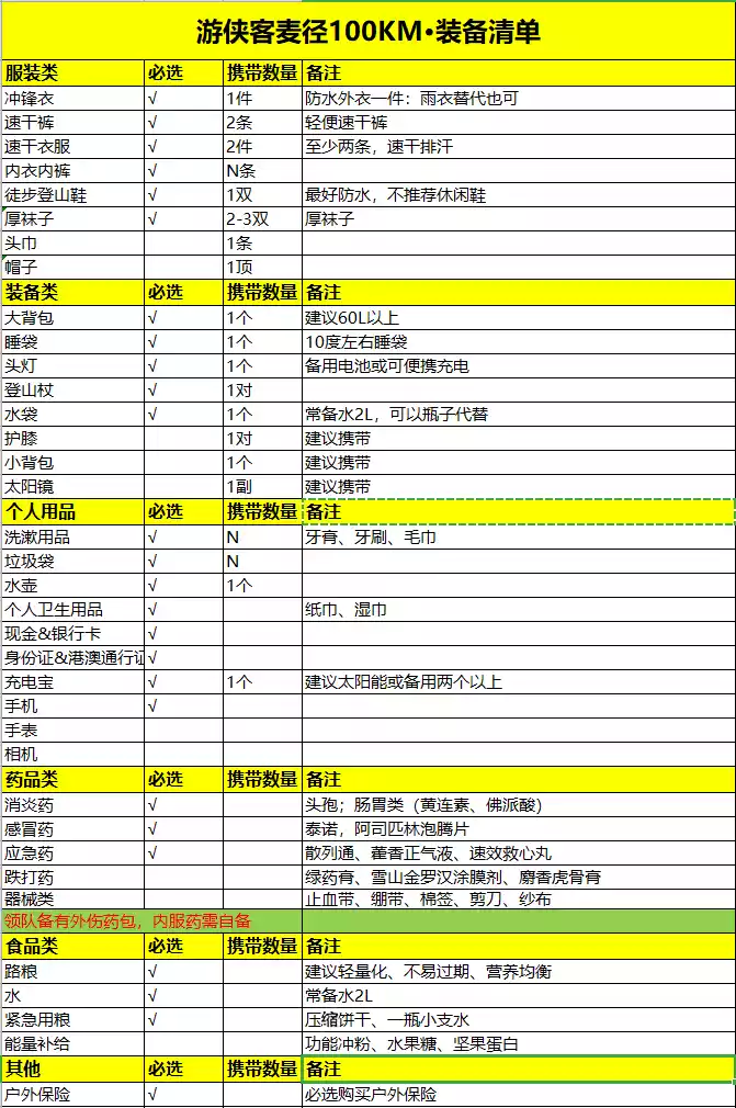 When it comes to gear, the key to packing heavily is simplicity. Avoid bringing items you won't use often. Avoid bulky or heavy items, and choose accordingly. For example, on the MacLehose Trail in the summer, you don't need a sleeping bag; just a jacket is enough. The following is a list of gear you can use as a reference.