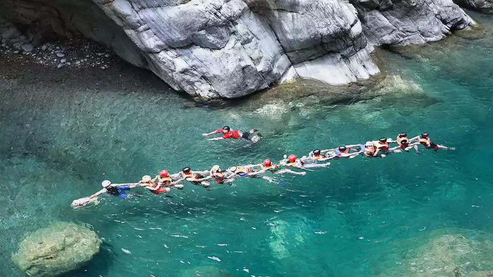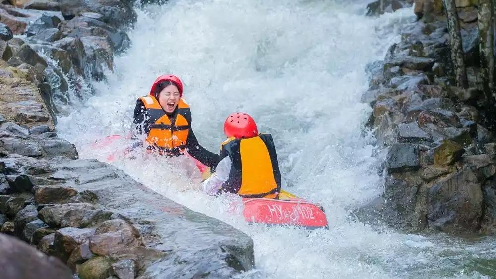 The Gorge and Cave Rafting course is 2 kilometers long, with a total drop of over 70 meters. The rafting course takes you down a double-S-shaped, vertical, pebble-shaped rapids, through a tunnel over 400 meters long, winding through rock formations. The entire rafting journey takes about 1.5 hours, passing through mountains, canyons, tunnels, and lakes along the way.