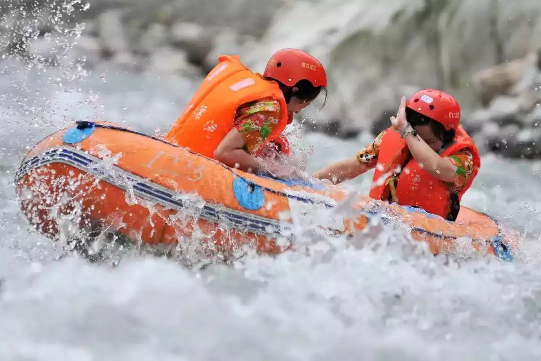 The Longjing Gorge rafting section is 3 kilometers long, with a drop of 128 meters from head to tail and a dive dam ranging from 3 to 5 meters. The entire rafting takes about 1.5 hours.
