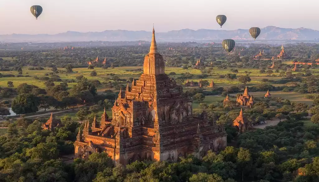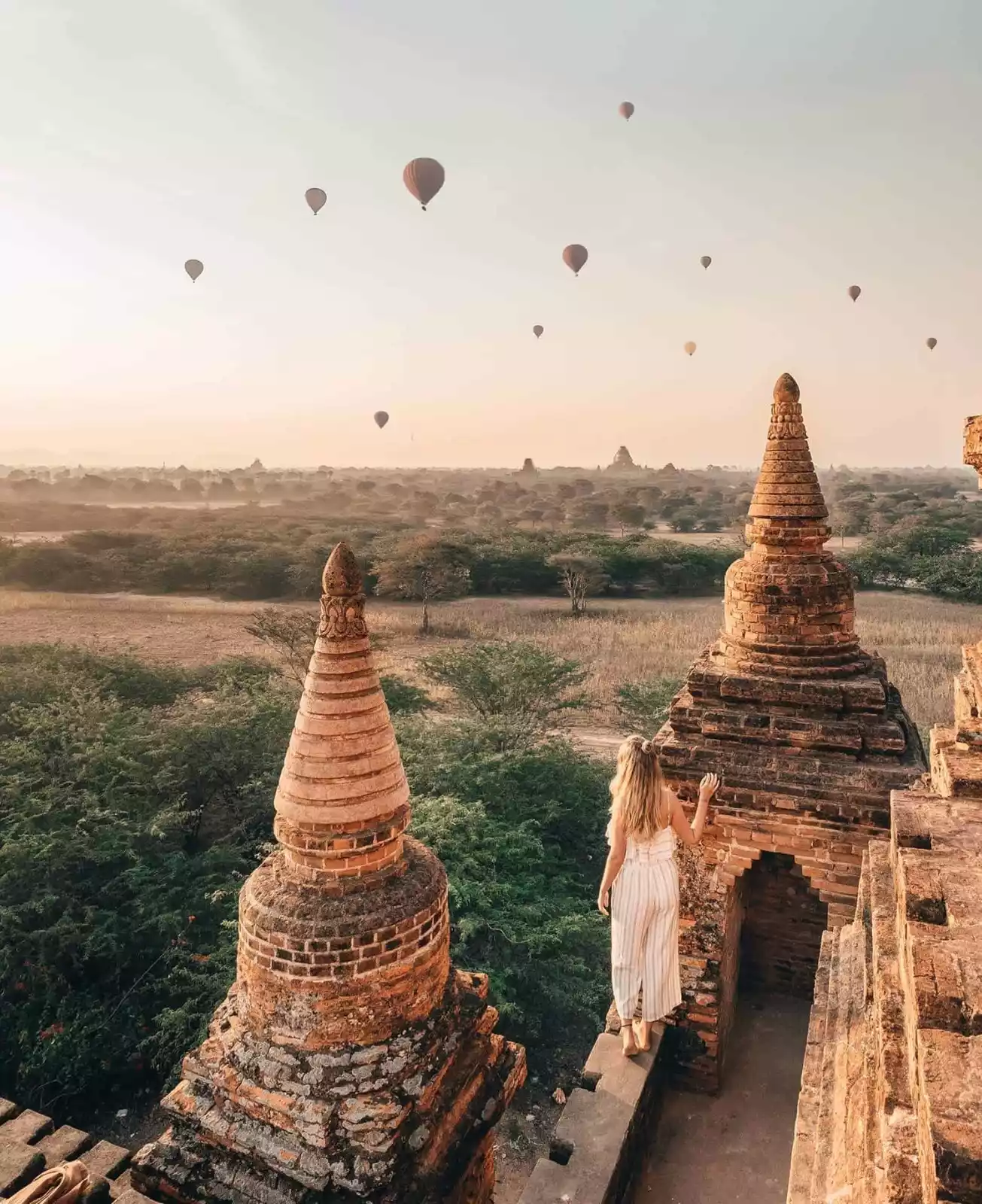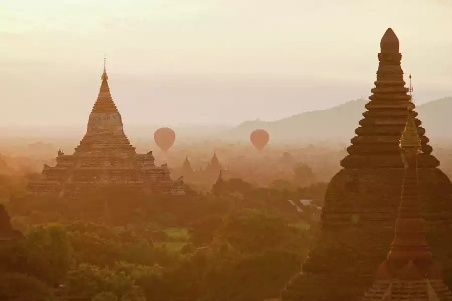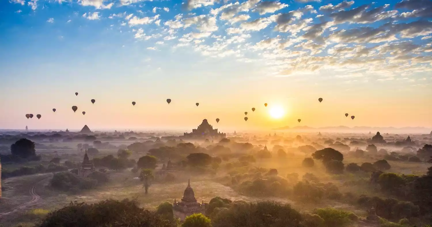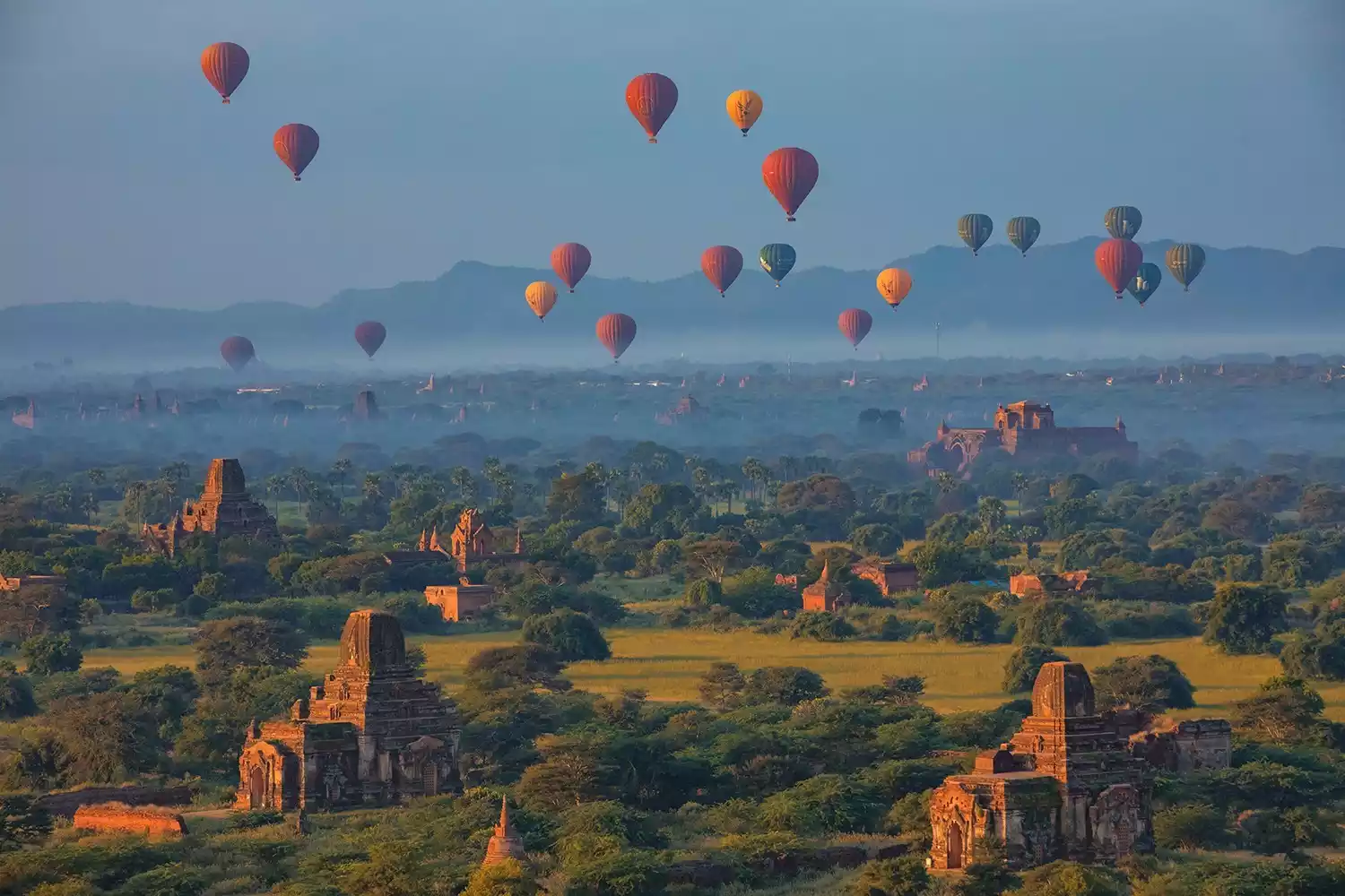 The sunrise over Bagan, the "City of a Thousand Pagodas," has been named one of the world's ten most beautiful sights. Every year from October to April, Morandi-colored hot air balloons take off over this historic city and sacred site.