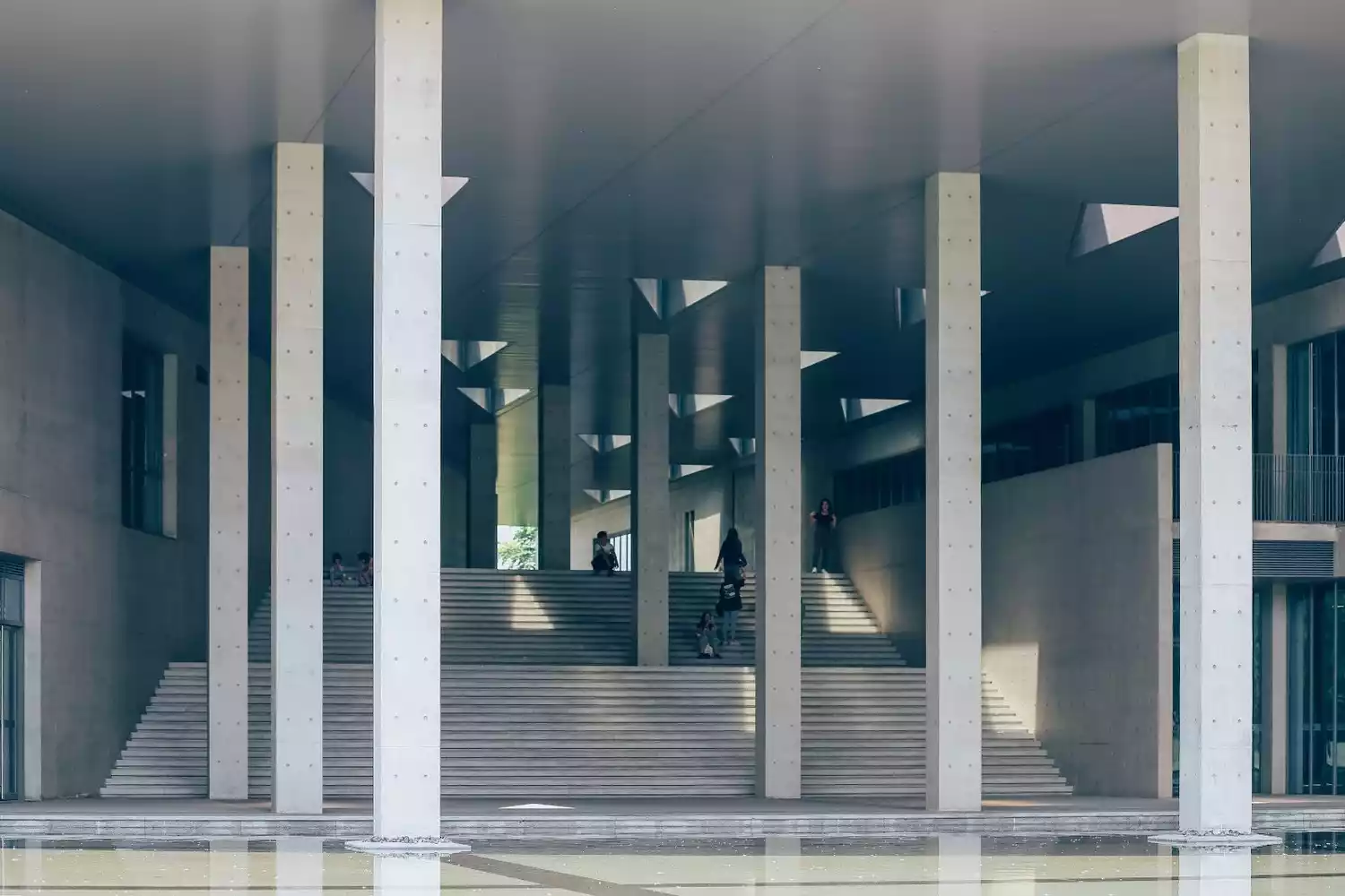 Tadao Ando uses simple language to create rich spaces, incorporating abstract elements from nature to elevate the spatial experience. Rooftop skylights, the water surface extending beneath the roof, and the cherry blossom path along the water's edge break the closed impression of bare concrete. Light, water, and cherry blossoms are three elements that Ando often employs, harmoniously integrated into the building's interior.