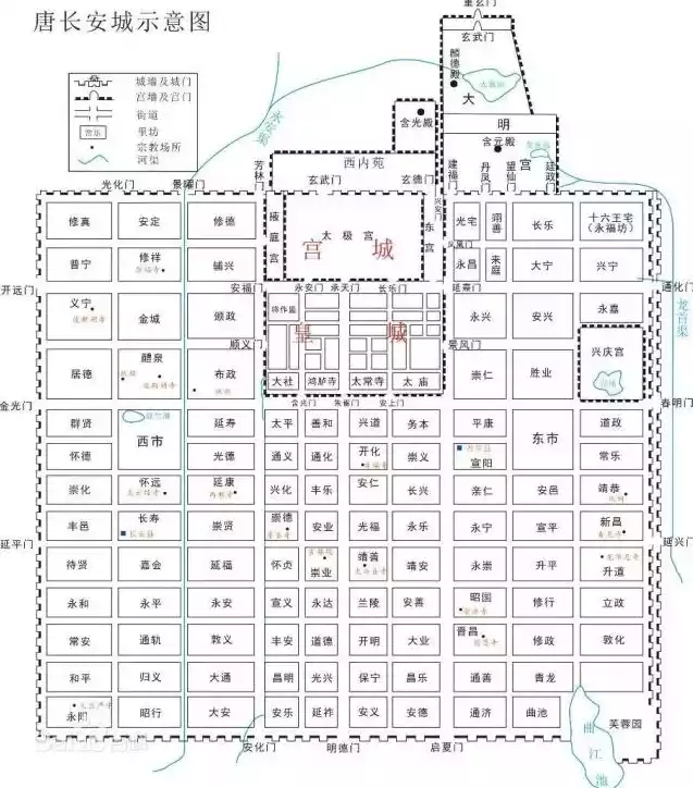 The Tang Dynasty's Chang'an City boasted a rigorous layout, symmetrical structure, and neatly arranged buildings. The outer city had three gates on each side, and six main streets connecting these twelve gates served as the city's main thoroughfares. Within the city, 11 main streets ran north-south and 14 ran east-west, dividing the living areas into 108 neatly arranged neighborhoods.