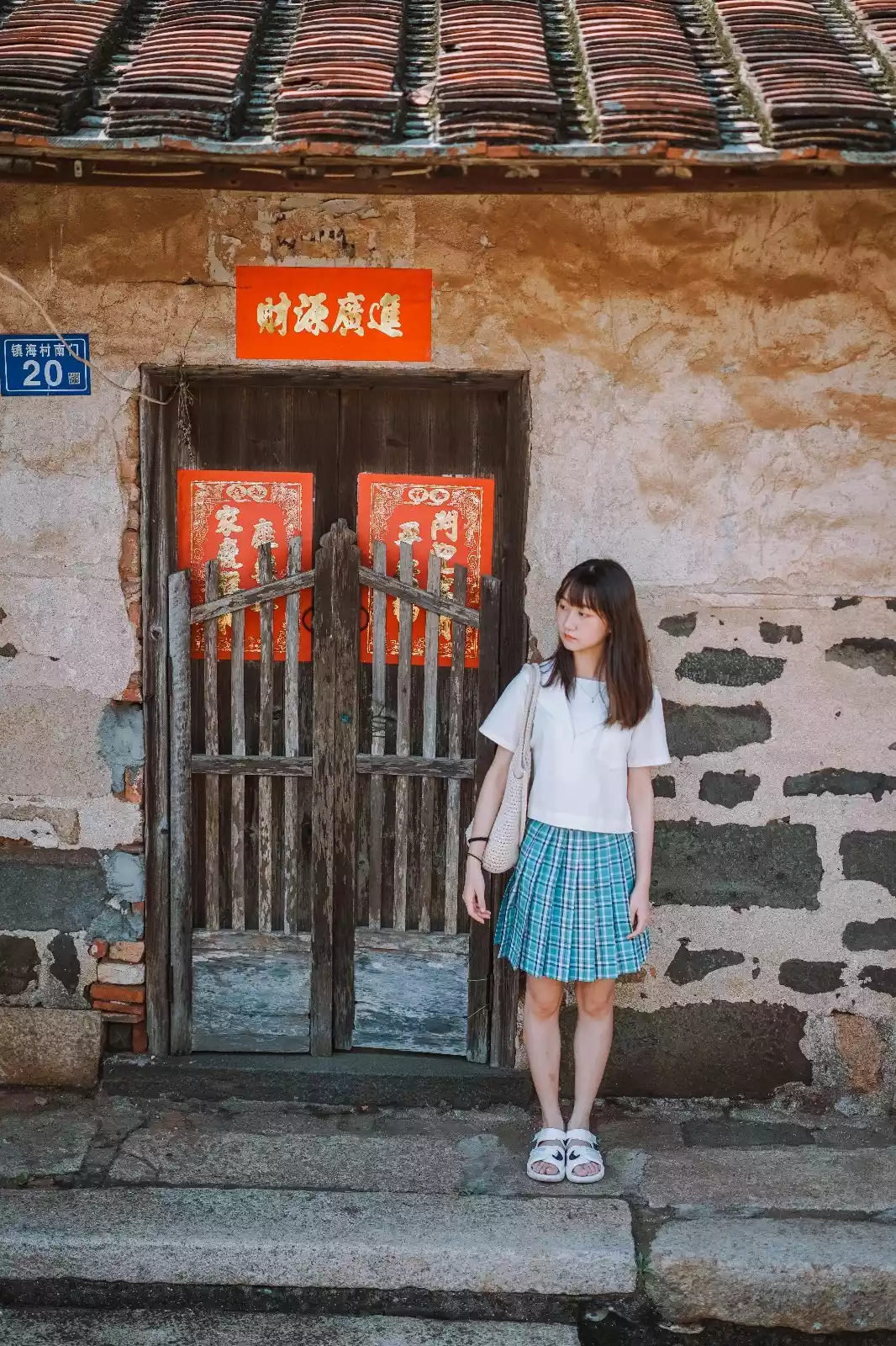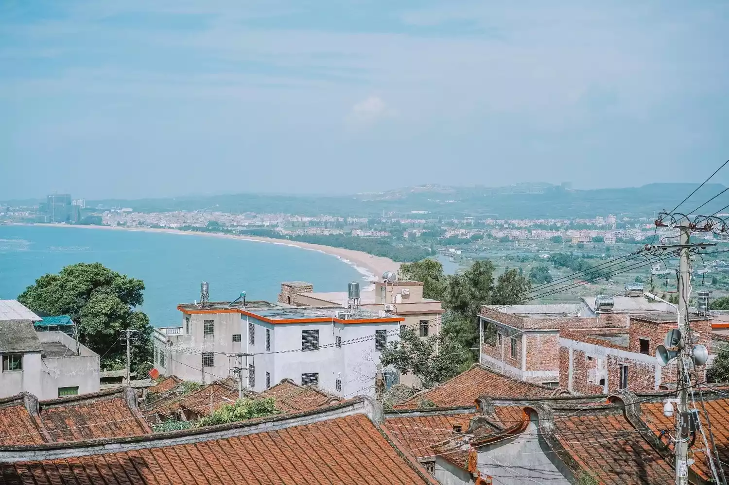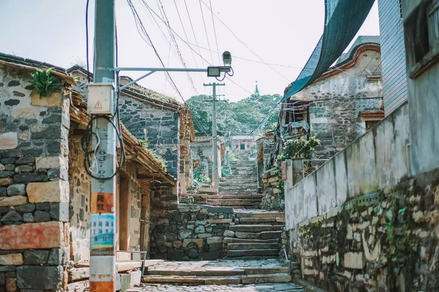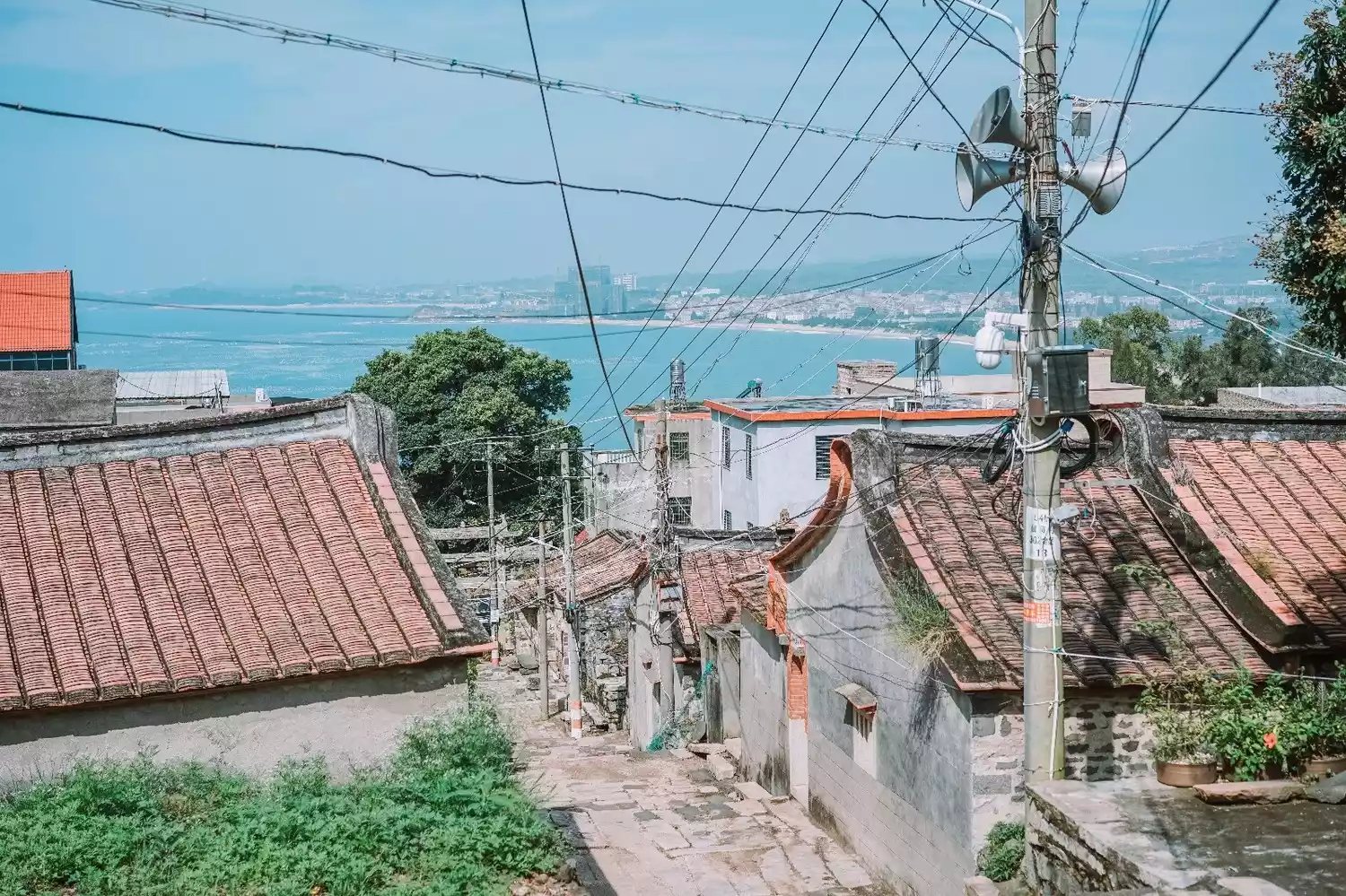 Walk up the stone steps to the top and you will find this great photo spot. Below you are a group of ancient stone houses from southern Fujian, and in the distance is a clear blue bay. It is super beautiful.