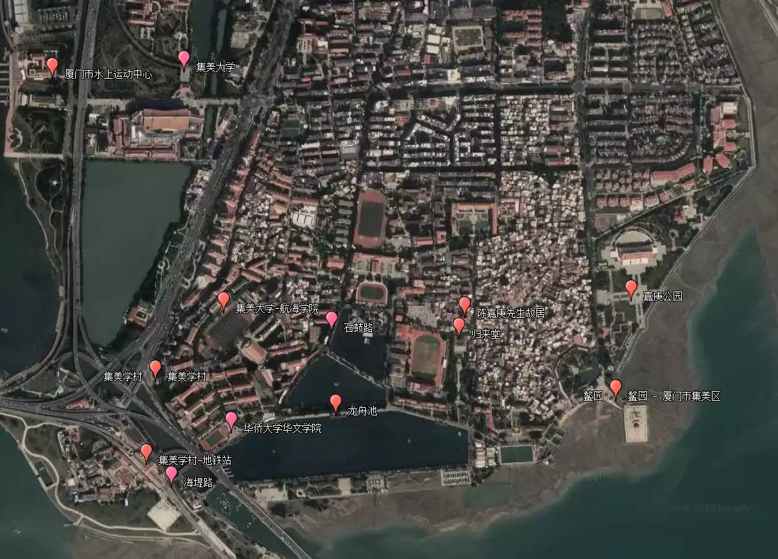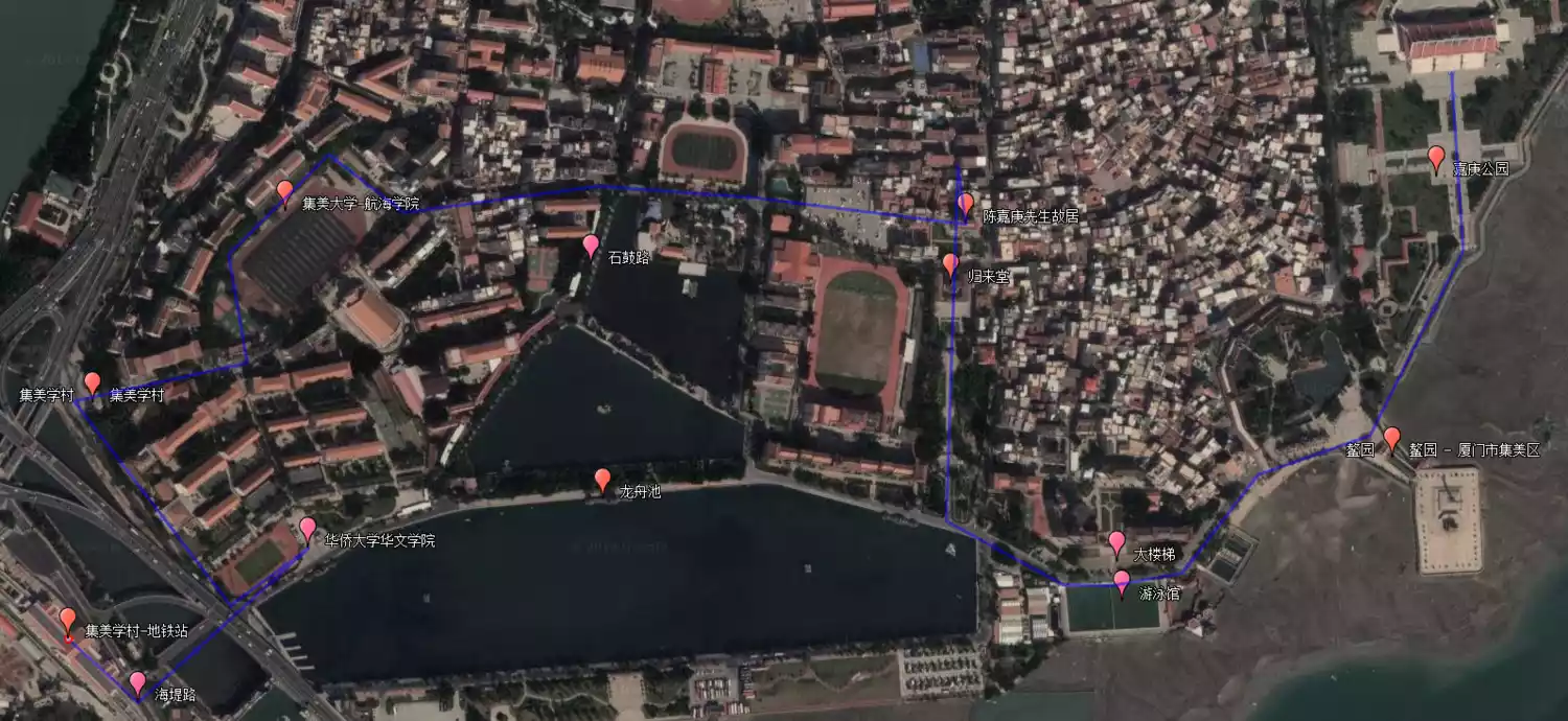 Jimei University Village Subway Station - Haidi Road - Huaqiao University Chinese Language and Literature College - Jimei University Village Building Sign - Jimei University Maritime College - Tan Kah Kee's Former Residence - Guilai Garden - Dragon Boat Pond - Grand Staircase - Natatorium - Aoyuan Garden - Tan Kah Kee Park - Jimei University - Aquatic Sports Center - Shigu Road