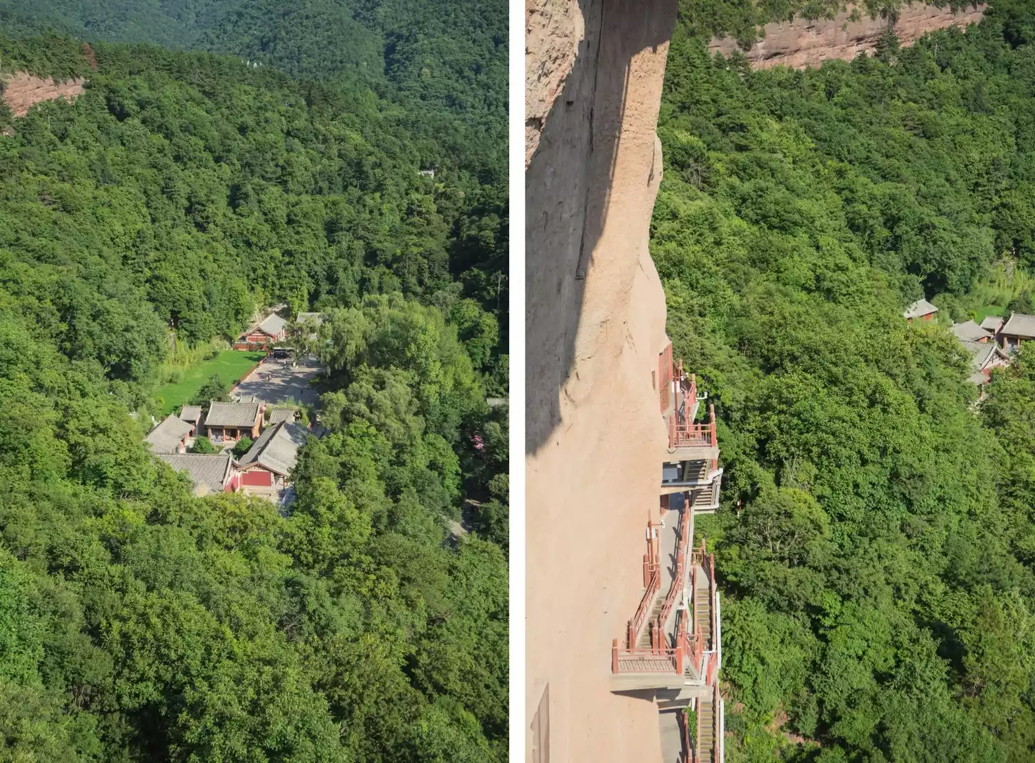 There are 221 existing caves in Maiji Mountain, divided primarily into the East and West Cliffs. Standing at the foot of the mountain, the opposite cliff is nearly vertical, dotted with caves of varying sizes. The main connection between the two cliffs is a plank road built over the air, and even before ascending, your legs feel weak.