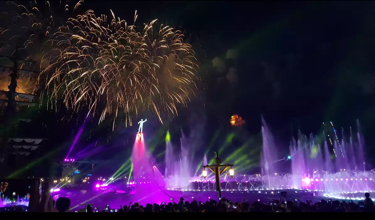 It brings together special effects such as fountains, projections, drones, aerialists, motorboats and fireworks. The fireworks are really beautiful! It is worth the price of admission
