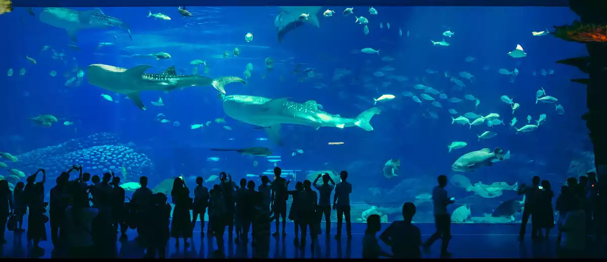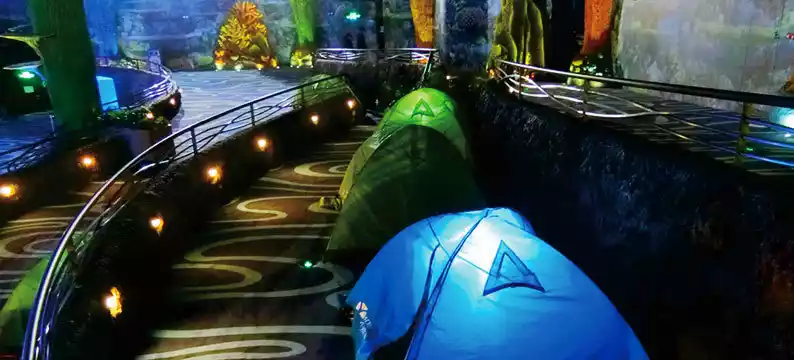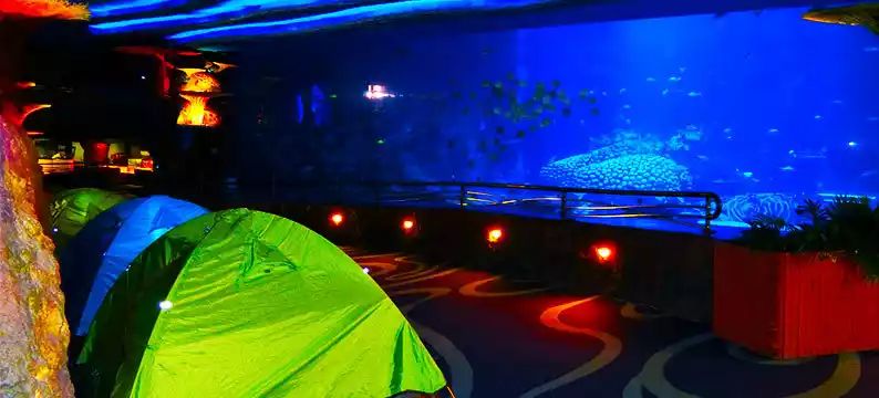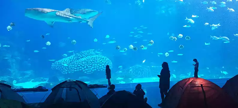 Camping underwater in the Whale Shark Pavilion! Sleeping with eight whale sharks and looking up to see manta rays floating by is so dreamy, it really feels like spending a night under the sea!