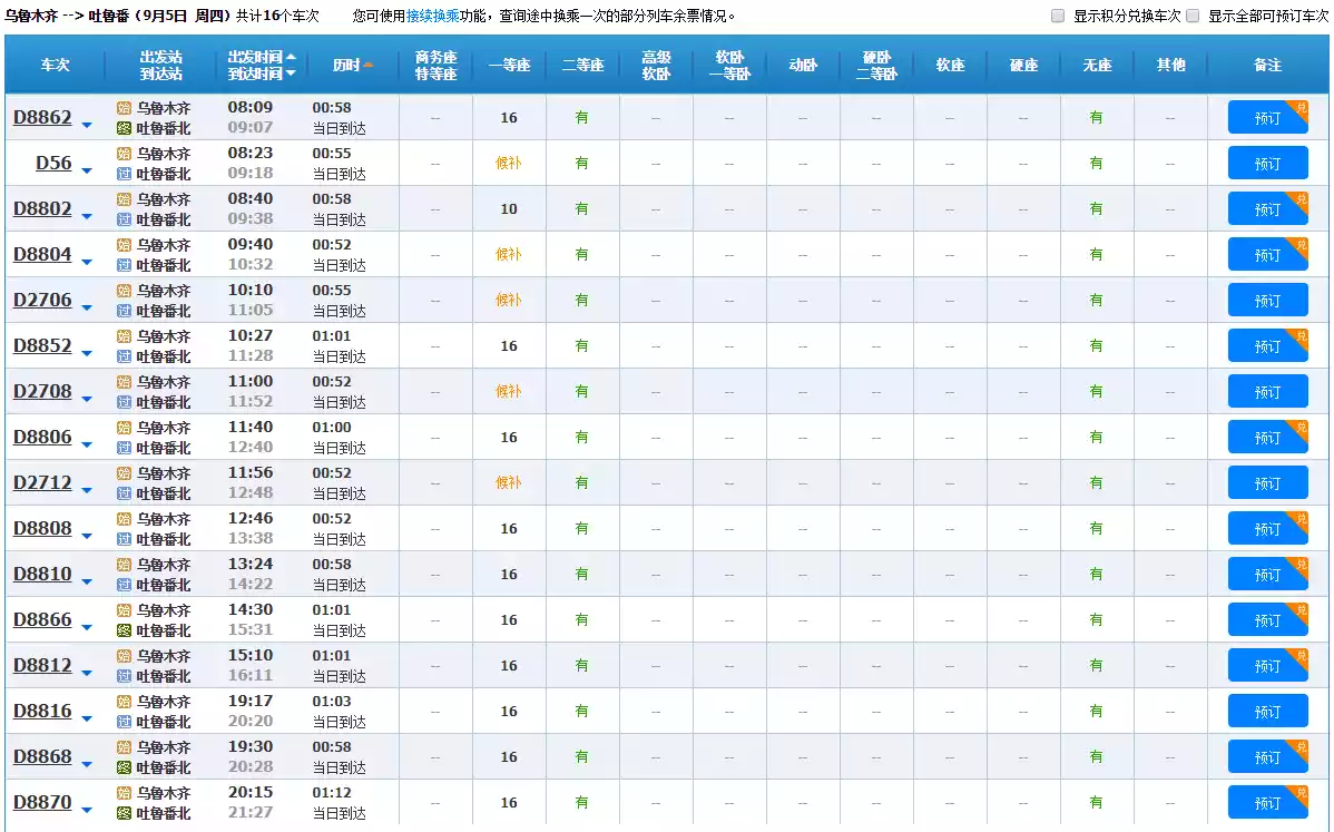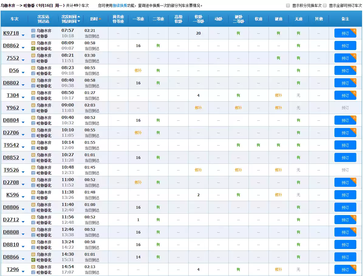 There are many trains from Urumqi to Turpan, including slow trains prefixed with K, tourist trains prefixed with Y, and high-speed trains prefixed with D. The train takes about 2.5 hours, and the high-speed train takes about 1 hour. There are many choices of schedules, and travel is convenient. It can be said to be the preferred mode of transportation.