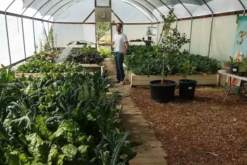 The farm has a vegetable garden greenhouse where many vegetables and fruit trees are grown, such as tomatoes, zucchini, kale, rosemary, cherries, etc.