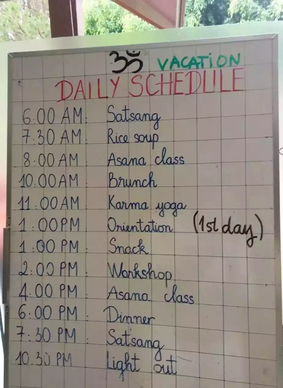 🕓Every day, you must attend satsang classes and two yoga classes.