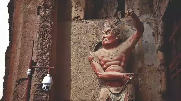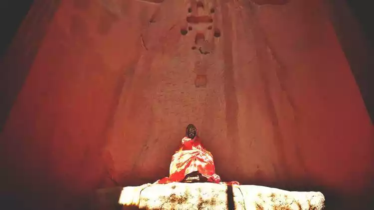 Seeing the fiery warriors, we are transported to the lands of the Sui and Tang dynasties, where the Heavenly King Treading on the Ox suppresses the earthquake and blesses the elegant statue of the Bodhisattva in the shrine. This statue is beautifully decorated, with flowing clothes, half-exposed chest, exposed arms, and voluptuous skin, fully demonstrating the grandeur of the Tang Dynasty.