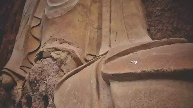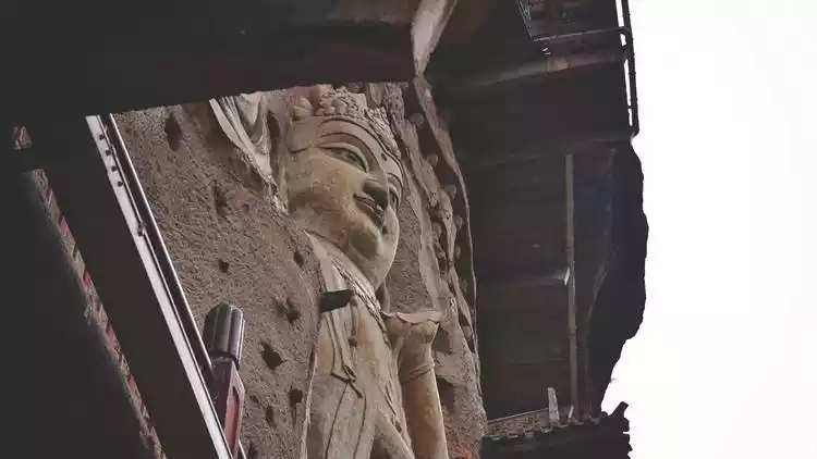 In addition to the Buddha statue in the cliff cave niche, there is also a large Buddha statue carved in relief on the outer wall. Although the Buddha's body is damaged, traces of past repairs can still be seen from a distance.