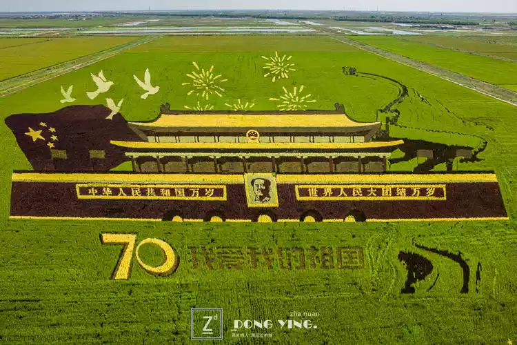 There are more than 240 acres of huge rice field paintings in Kenli District, Dongying, which are now in their best viewing period. The themes of this year's paintings are "I Love My Motherland" and "The Yellow River Flows into the Sea and We Go Home", as a tribute to the 70th anniversary of the founding of New China.
