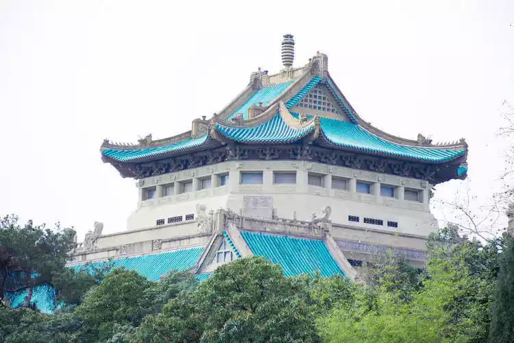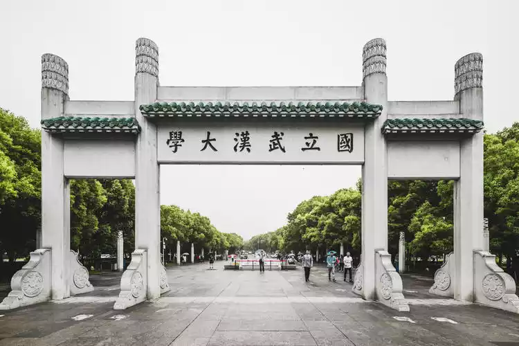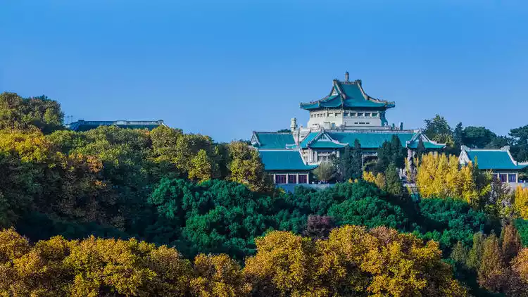National Wuhan University is located on the banks of East Lake and surrounded by Luojia Mountain. The campus is shaded by green trees.