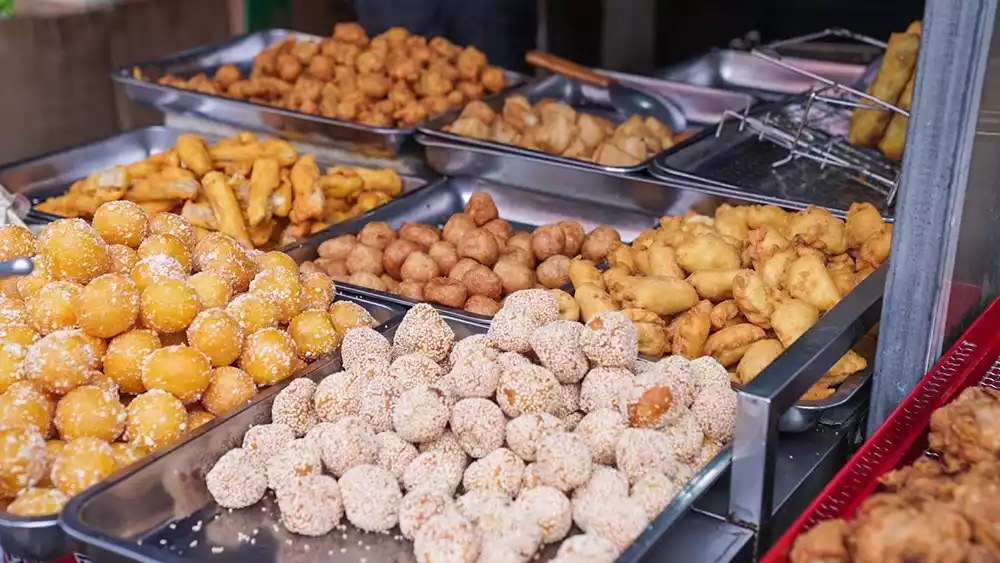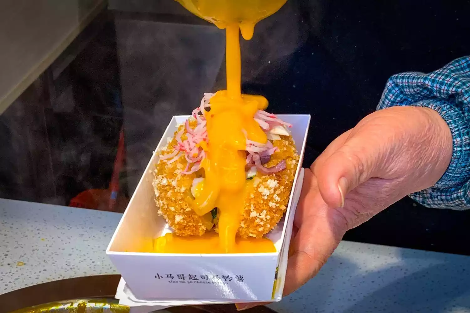 You can find the popular "Xiao Ma Ge" (Little Ma Ge) snack in Zengcuo'an, where you'll have to queue up for it on Gulangyu Island. This creative snack is made by peeling a whole potato, mashing it into a paste, coating it in breadcrumbs, and deep-frying it. It's topped with homemade cheese sauce and tastes soft and fluffy.