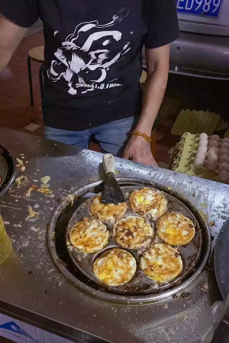 Zhong Lijun's Manjiangao at the Eighth Market is incredibly popular, thanks to its location inside the market. They have two stalls, one specializing in sesame-filled and the other in peanut-filled. The sweet, bouncy cakes instantly brighten your day. A single Manjiangao takes less than 10 minutes to make and remove from the pan, perfect for the fast-paced early morning life at the Eighth Market.