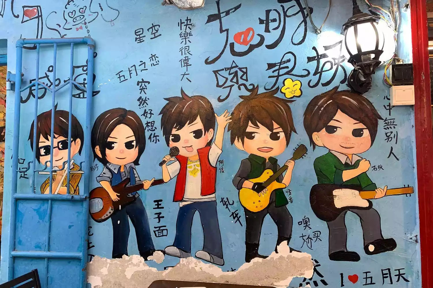 There are Q-version cartoon images of Mayday painted on the walls of the store, Mayday's music is playing, and even the owner himself looks a bit like Ashin.