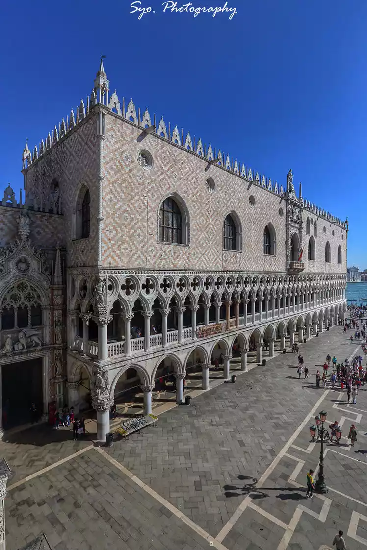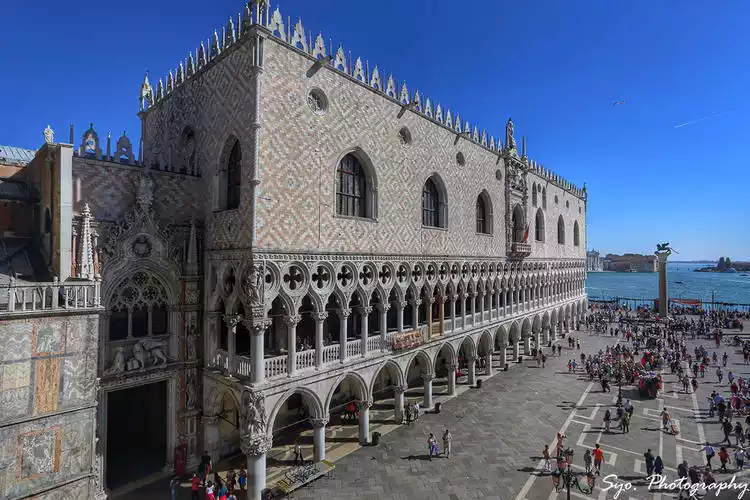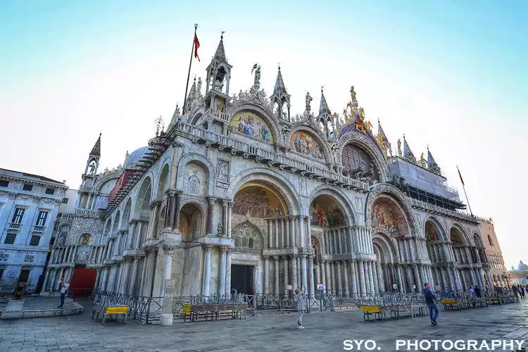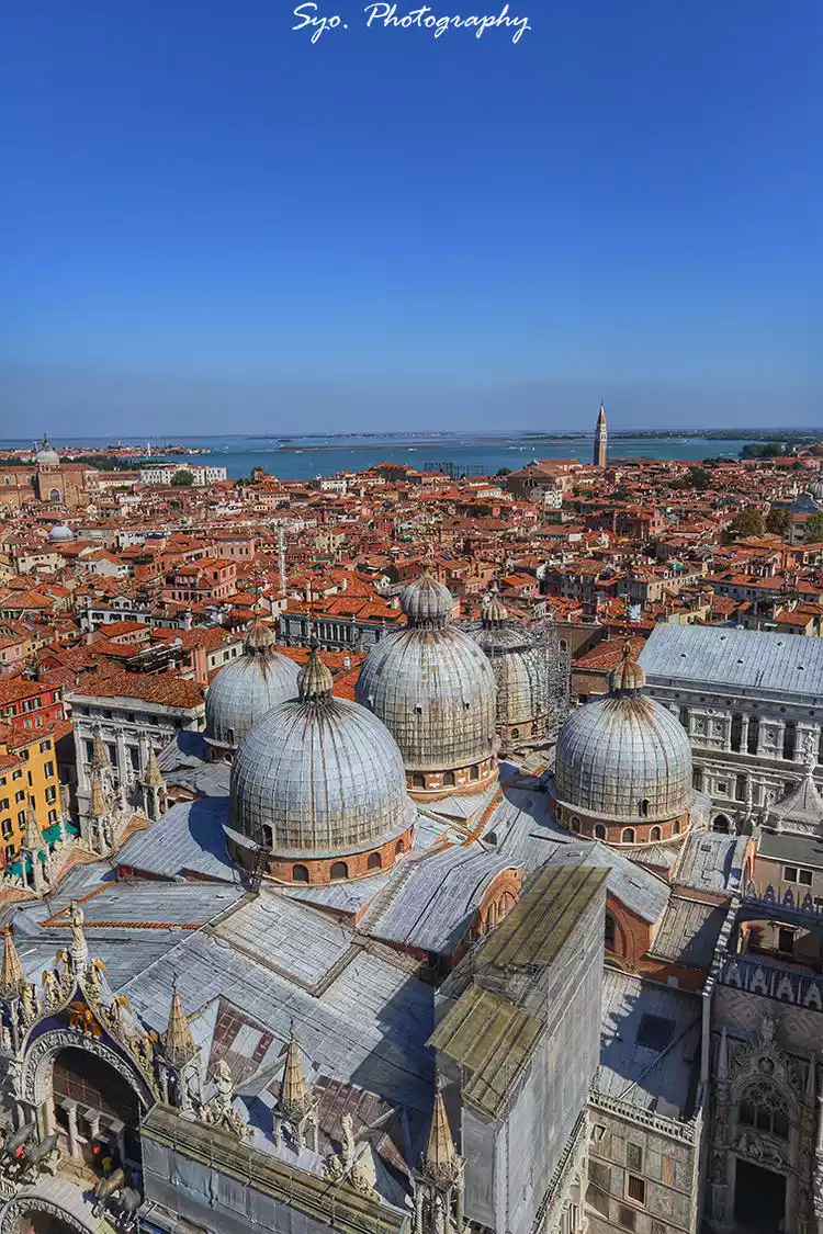 From here you can clearly see St. Mark's Basilica, with its onion domes arranged in a regular cross shape, which is a representative work of Byzantine architecture.