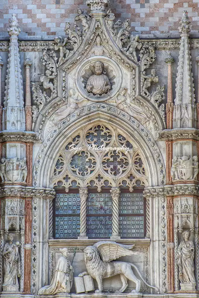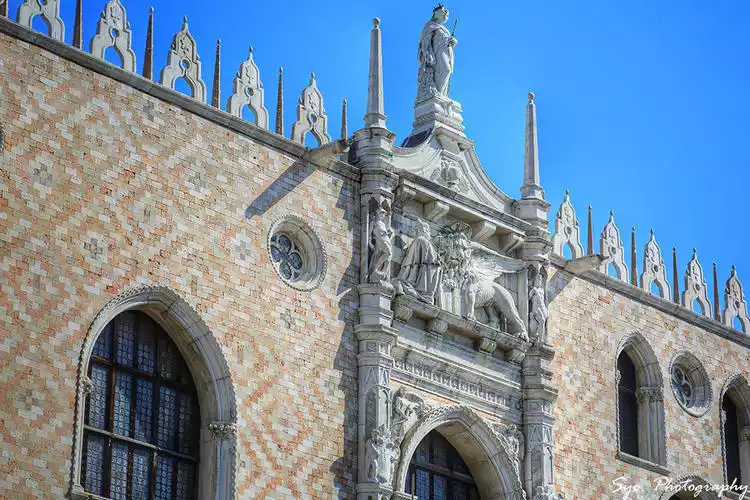 The Doge's Palace is flanked by a stone lion statue, the model for the Venice Film Festival's Golden Lion. The palace is divided into two floors: the first floor is an open gallery, and the second floor is a sky balcony. The ninth and tenth pillars on the second floor are a darker shade of light red, and the space between them is used to post death sentences.
