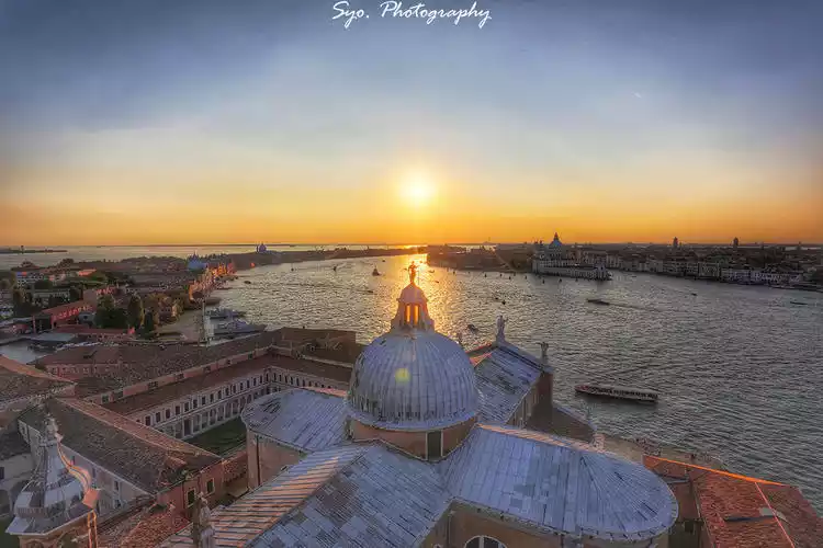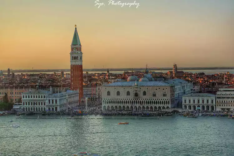 St. Mark's Campanile is the perfect spot for panoramic photos of Isola San Giorgio Maggiore. The Church of San Giorgio Maggiore is the perfect spot for photos of the Grand Canal, the Doge's Palace, and the architectural complex of Piazza Venezia! From here, you can enjoy a 360-degree view of Venice's main island and outlying islands. Watching the sun slowly sink into Venice at dusk is an indescribable romantic beauty. If you have time, come here to admire Venice at dusk; it's a truly memorable experience.