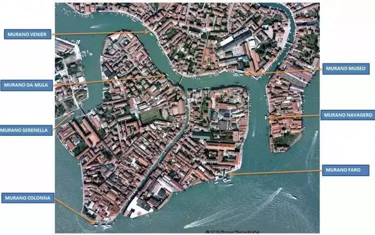 There are several bus stops on the island, because the bus boat circles the entire island. MURANO COLONNA (get off here to see the glass factory and restaurant Glass Island Shop) MURANO FARO (take the No. 12 boat here to the Colorful Island) MURANO MUSEO (the Glass Museum and the location of the Glass Island Church) MURANO SERENELLA MURANO DA MULA MURANO NAVAGERO MURANO VENIER Here is the Glass Island bus map: