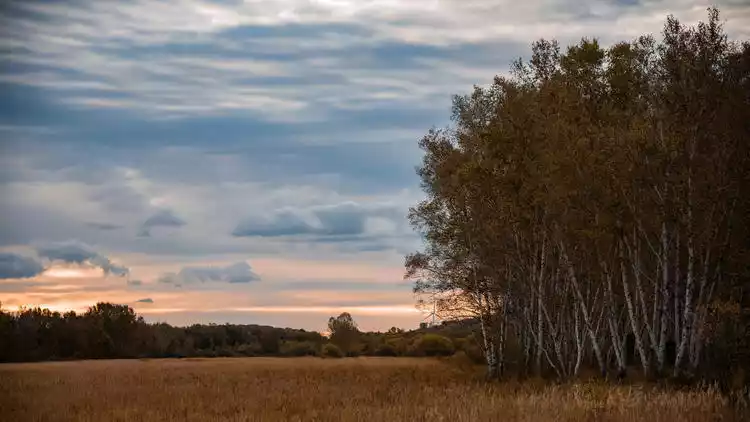 The birch forests and reeds complement each other, and the fallen leaves and white tree trunks all over the ground create a winter atmosphere.
